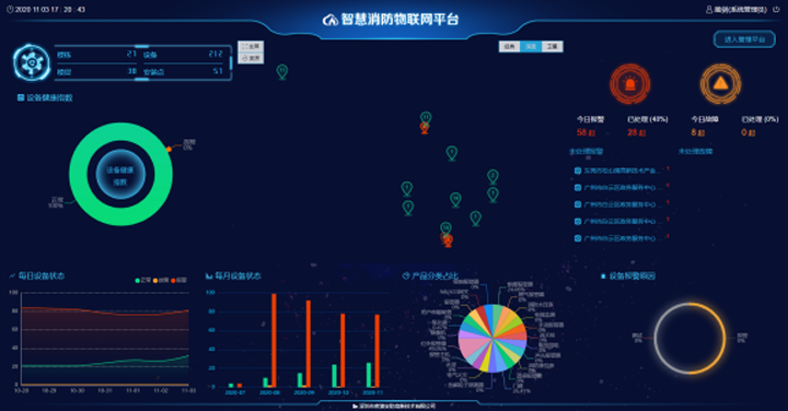 驰通达电子智慧物联网云平台是用于智能设施的监控、管理和维保的平台软件。基于云平台的架构,结合物联网+互联网技术将分散在各处的智能设备(感烟火灾探测器、门磁、红外探测器等)统一实时监管,并将收集到的数据进行智能化分析,在城市消防设备巡安检、实时监测、维护及综合管理等方面,提供全面、准确、及时的信息反馈。监控中心可支持APP、短信、微信公众号、电话等多平台报警方式。